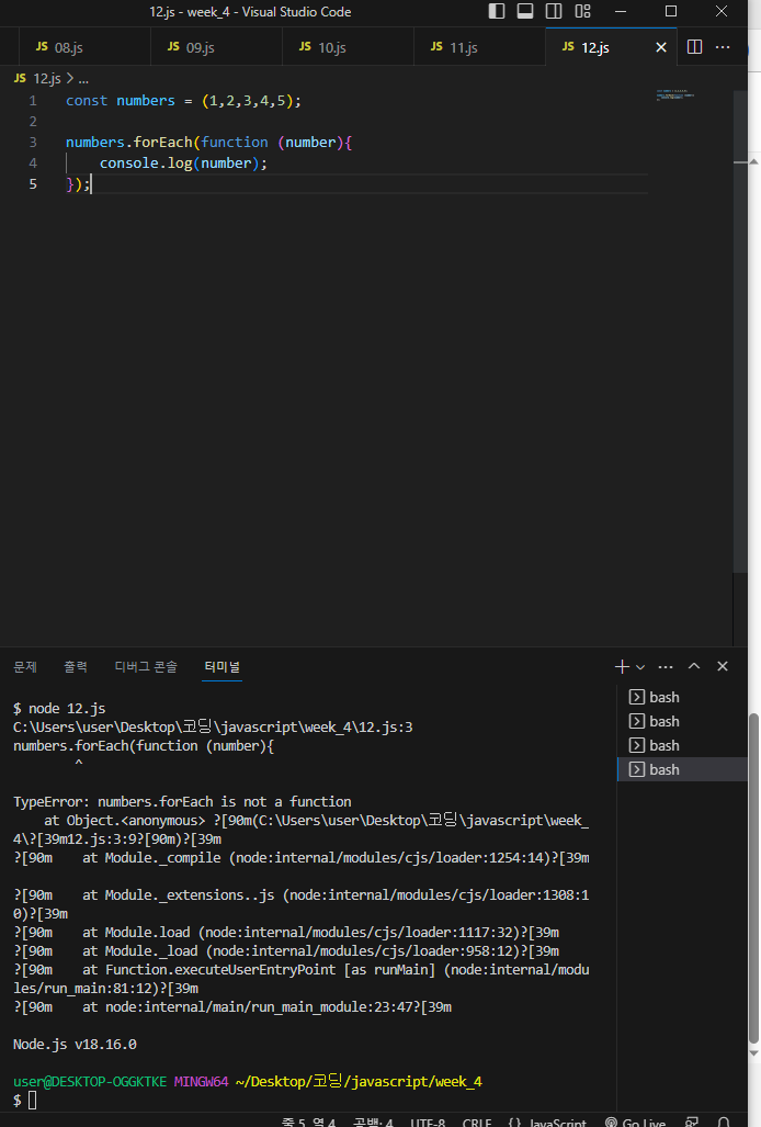 이렇게 forEach문을 연습하려다 오류가 나는 것이였다. 왜이럴까? 라고 생각하며 코드와 오류를 읽어보는데