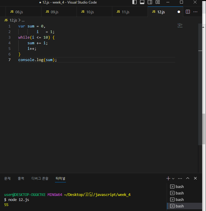 sum(합계)으로 1~10숫자들을 모두 더한 값. 즉 55가 터미널에 찍히는걸 볼수있다.