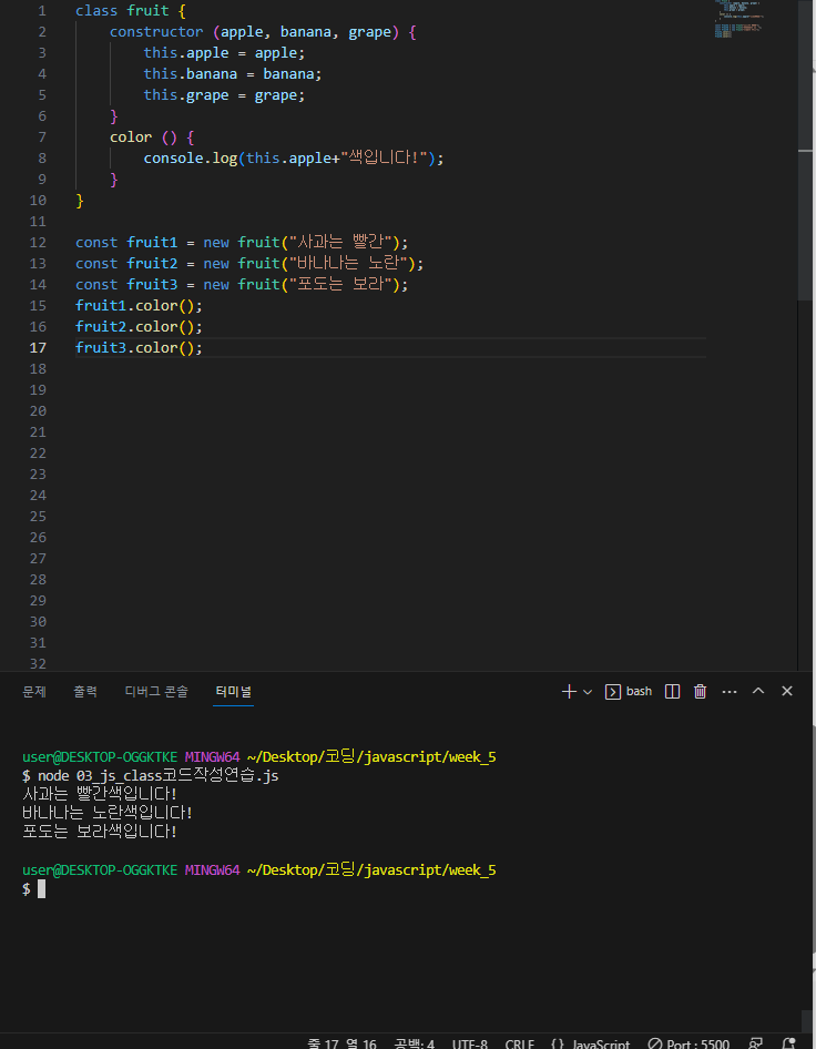 1.먼저 class 라는 키워드를 사용해 객체이름을 아무거나?...과일(fruit)로 작성해준다.