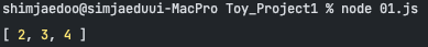 배열의 인덱스는 0부터 시작하는데 위의 방법으로는 1~3까지의 인덱스 값들을 가지고 온다는 뜻이여서 결과값이 [2,3,4] 가 나올것이라고 나는 예상을 했다. 그리고 터미널을 통해 실제 결과값을 확인해보면,