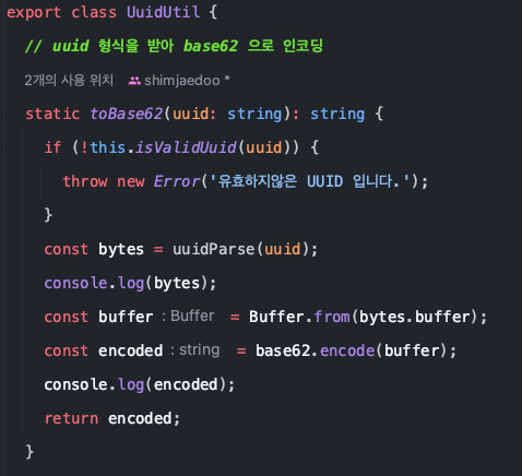 이 메서드는 uuid 형식의 문자열을 받을 때 base62 형식으로 인코딩을 하려고 만들었다. 첫 번째로는 입력받은 uuid가 유효한 형식이 아닐 경우에 오류를 반환하도록 만들었고, 다음은 uuid를 byte로 만들었다. 그리고나서 반환된 byte들을 Buffer를 사용해 만들고 base62.encode를 통해 인코딩을 하도록 만들었다.