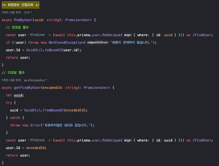 findByUser 함수를 보면 먼저 prisma.findUnique라는 메서드를 사용해서 해당 ID를 찾고, 조회된 유저의 정보는 IFindUser 라는 인터페이스를 만들어 타입캐스팅을 하였다. 그리고 사용자를 찾지못하면 오류를 발생시키게하고 찾은 유저의 ID를 base62로 인코딩하고 Id 라는 필드에 저장하도록하였다.