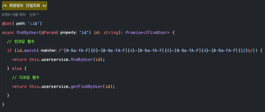 둘 다로 조회를 하기 위해 findByUser(uuid 형식일 경우) 와 gerFindByUser(base62 형식일 경우) 라는 함수를 만들었다.
