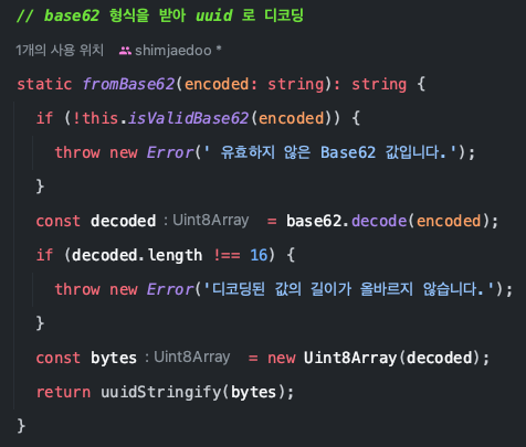 이 메서드는 위에와 반대로 base62 형식의 문자열을 받을 때 uuid형식으로 디코딩 하는 함수이다.
