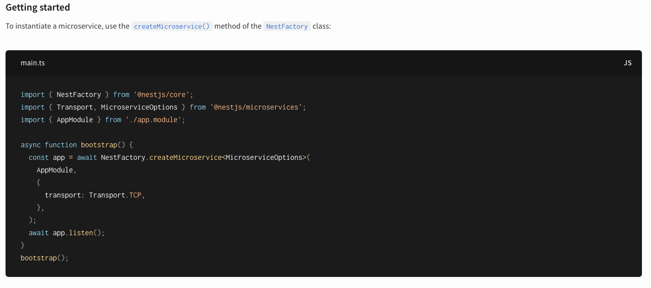 위의 방법대로 시도를 해봐도 똑같은 오류가 발생을 해서, 처음 이 프로젝트를 기획했을 때 봤던 공식문서를 다시 보기로 하였다.구글에서 nestjs msa connect ECONNREFUSED 이렇게 검색을 하였더니 NestJS 공식문서가 있어 참고하였다.